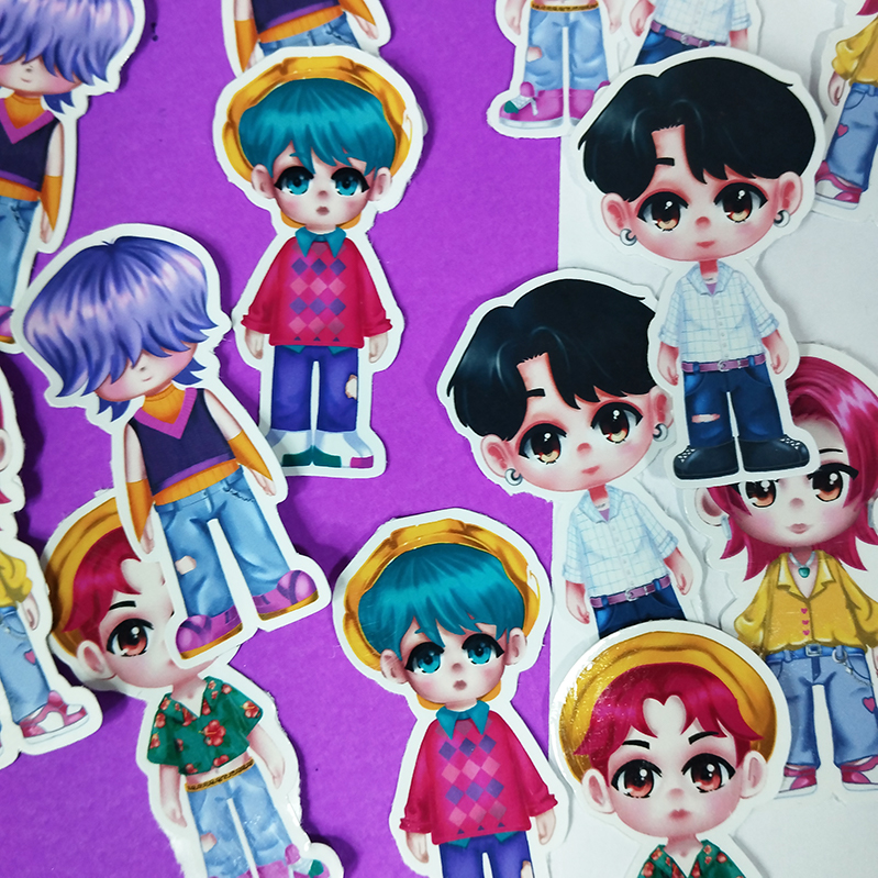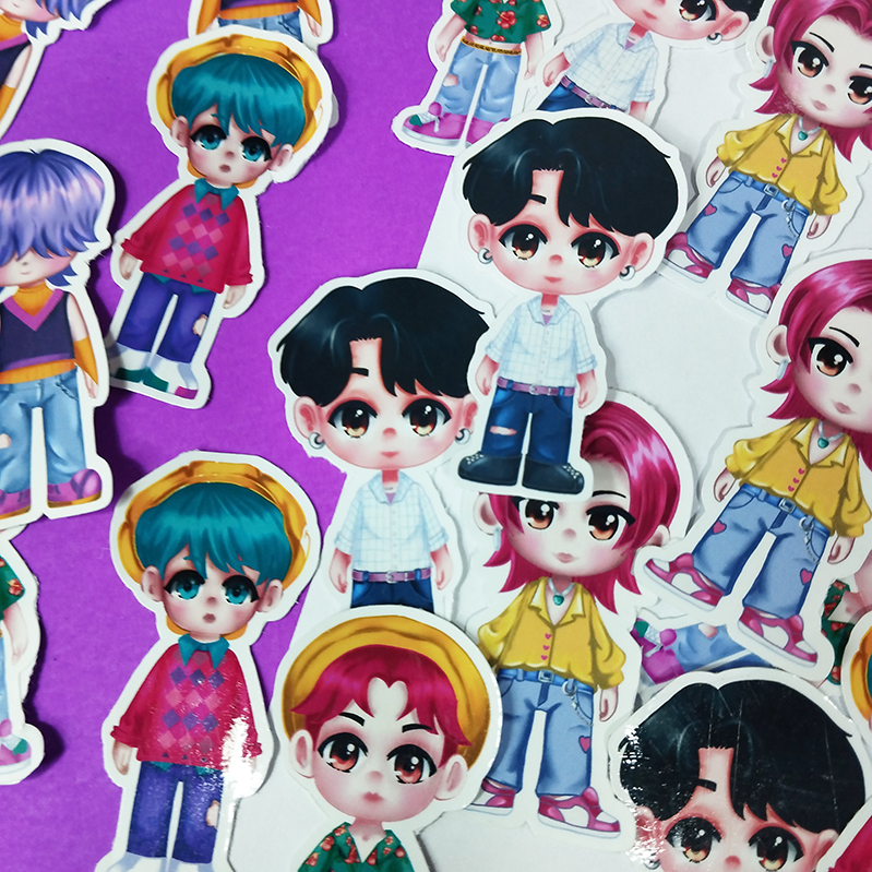 Kesim:Özel kesimli (Die-cut veya Kiss-cut). (Görselde her karakterin etrafında kolayca soyulabilen kesim çizgisi olduğu görülüyor.)