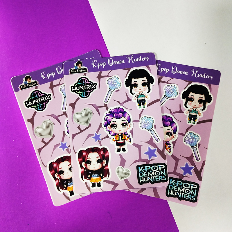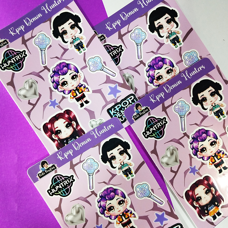 K-Pop Demon Hunters`ın kahraman grubu Huntrix (Rumi, Mira, Zoey) üyelerinin chibi versiyonlarından oluşan özel sticker seti. İkonik aksesuarlar ve logoları da içerir.